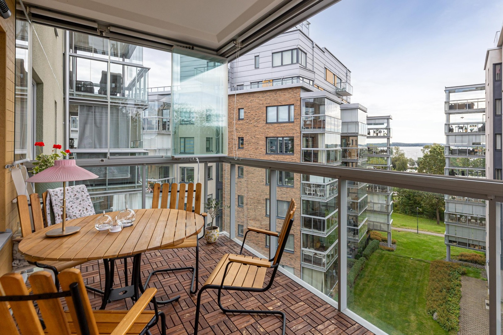 Underbar, inglasad samt rymlig balkong. Skjutbara glaspartier (övre delen ovanför räcket). Utsikt mot Mälaren och grönska.
