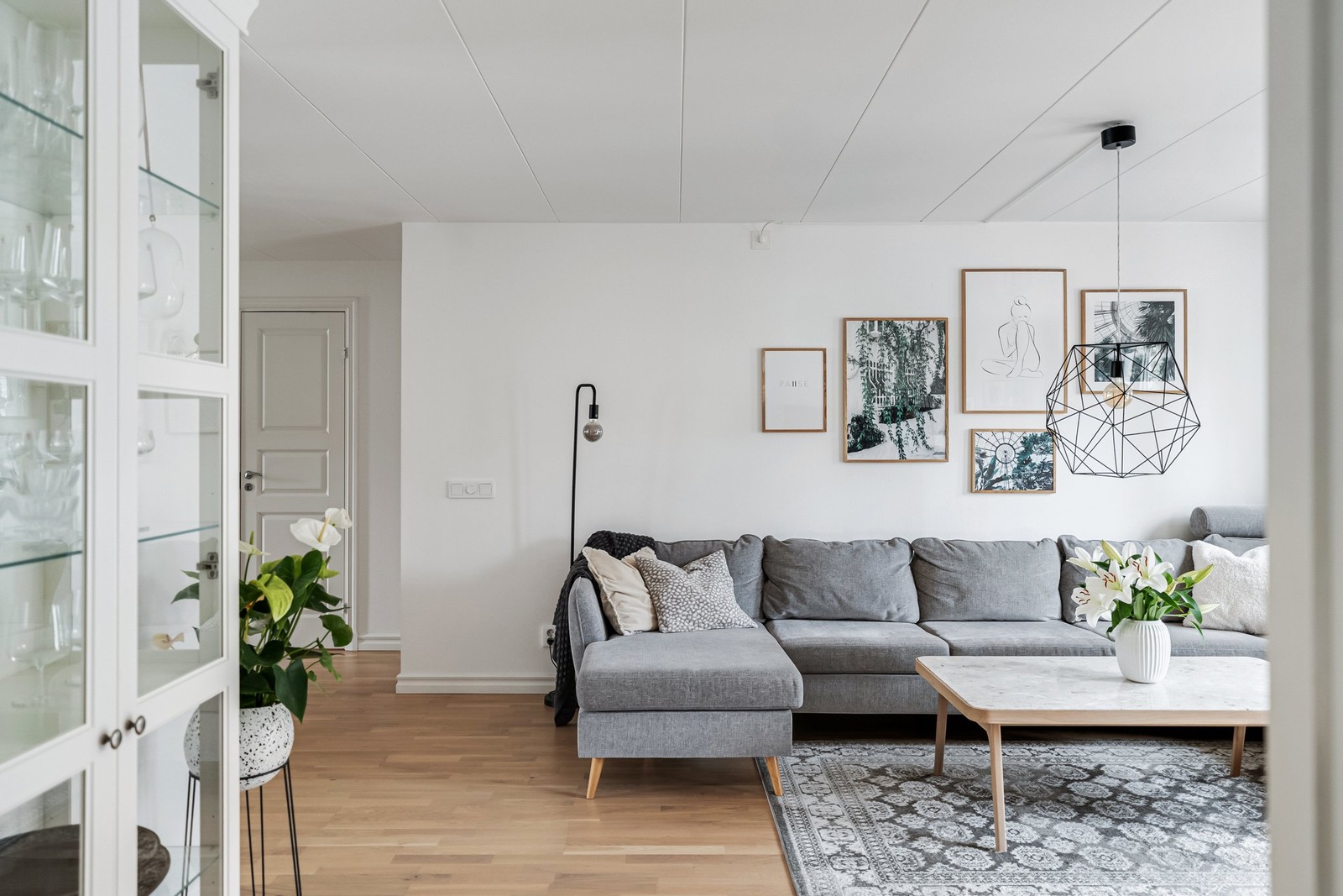 När du kliver in i bostaden möts du av ljusa, luftiga ytor och en genomgående öppen planlösning som ger ett vackert och harmoniskt helhetsintryck. De stilfulla parkettgolven löper genom rummen och samspelar fint med bostadens ljusa färgval. Hallen är både inbjudande och praktisk med klinkergolv och gott om plats för avhängning.