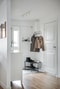 Direkt till vänster ligger det renoverade badrummet, smakfullt utformat med dusch bakom vikdörrar och en egen tvättdel som förenklar vardagen. Från hallen når du även en tilltagen klädgarderob med hyllplan för maximal förvaring.
