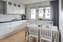 Köket ligger i naturlig anslutning och har en stor öppning mot övriga bostaden, vilket ger en fin kontakt mellan rummen. De vita ramluckorna, den vackra stenskivan och den genomtänkta planeringen skapar ett kök som är lika funktionellt som estetiskt tilltalande. Här finns gott om plats för matgäster och från köket nås även balkongen, vilket gör det enkelt att låta inne och ute mötas under årets varmare månader.