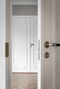 Badrummet går i samma stilrena utförande som resten av lägenheten och är satt i en ljus ton. En oerhört snygg carraramarmor ligger på golvet och kombineras fint med det vita Metrokaklet på väggarna. Handfat och toalett kommer från klassiska Burlington och en passande liten glashylla är placerad mellan handfat och spegel. Duschen är väl tilltagen i sin vinkelform och vid sidan av den glasade duschväggen finns förberett för tvättmaskin. Golvvärme finns för optimal komfort.