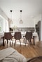 Det klassiska köket från Sentens går i vitt och möter en mörk bänkskiva som ger en exklusiv kontrast. Den maskinella utrustningen består av rostfria vitvaror – induktionshäll, ugn, spisfläkt, mikro, diskmaskin samt kombinerad kyl och frys – och den öppna planlösningen mot vardagsrummet skapar sociala ytor med en självklar rymd.