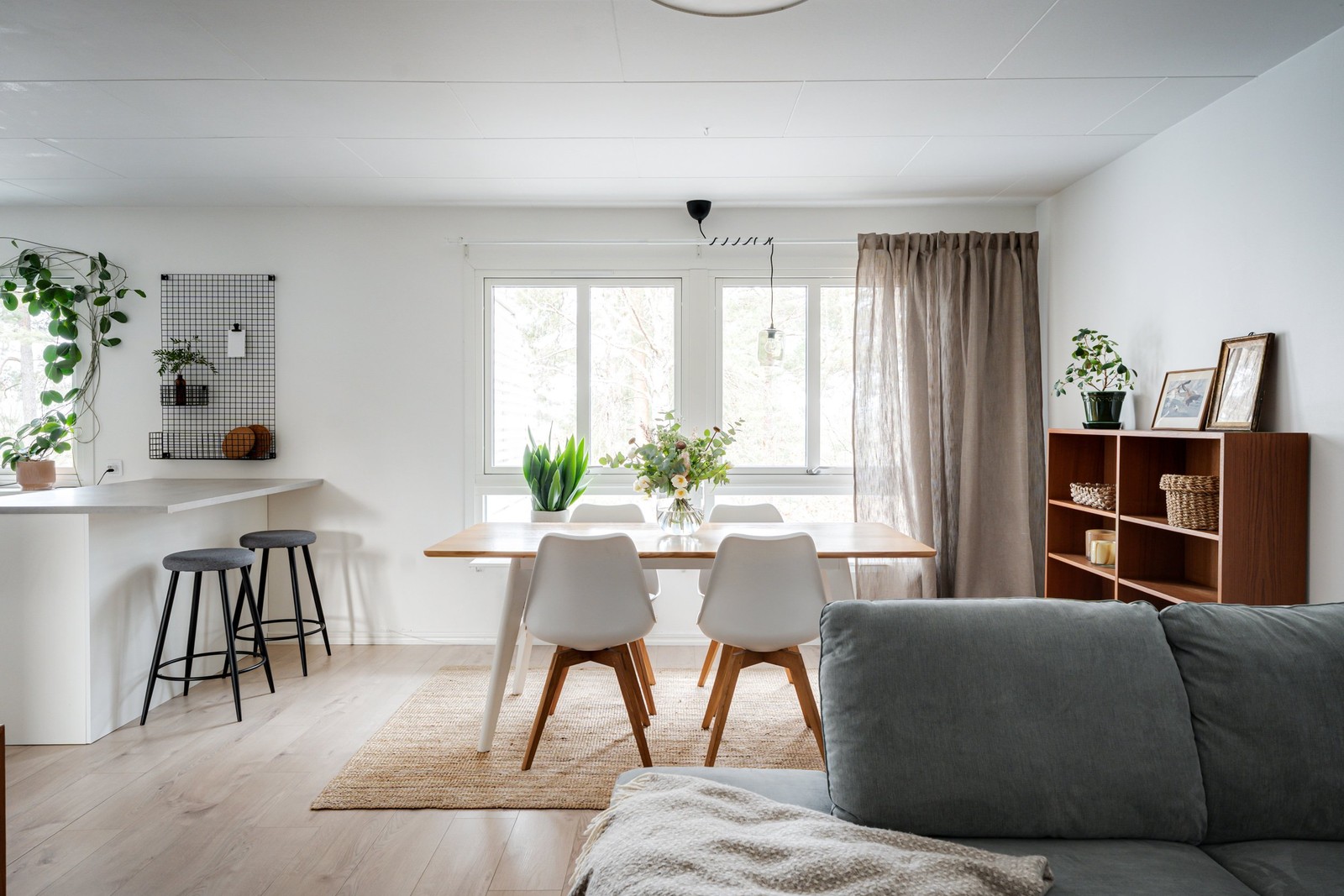 Vardagsrummet är luftigt och ljust tack vare stora fönsterpartier som släpper in rikligt med dagsljus. Härifrån har du en rogivande utsikt över skogen och dalgången bakom huset, vilket ger hemmet en harmonisk och naturnära känsla. Interiören har uppdaterats med nya golv samt målade och tapetserade väggar, vilket bidrar till ett enhetligt och modernt intryck.