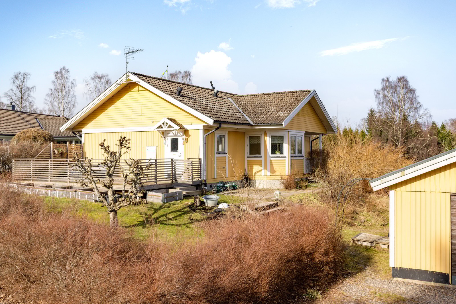 Lättskött trädgårdstomt omgärdad av häckar. Perfekt för såväl odling som lek.