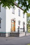 De pampiga entrédörrarna i ek, med stiltrogna smidesdetaljer, är inramade av en detaljskuren träportal med blyinfattat överfönster. På kvällarna lyser en traditionell vagnslykta upp entrén. Om du vänder dig om på den höga förstubron i sten öppnar sig utsikten ner över grässlänten och ut över sjön.