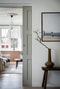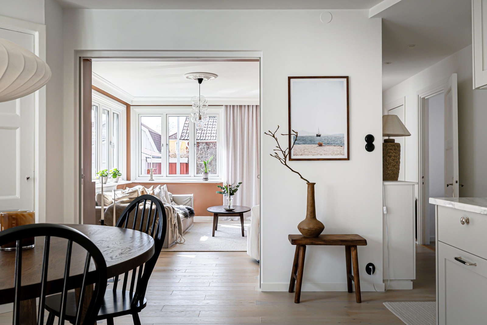 Redan i hallen möts du av behaglig golvvärme som sätter tonen för resten av hemmet. Vidare in finner du ett elegant kök med mjukstängande luckor och noggrant utvalda materialval. De handmålade spegeldörrarna och den platsbyggda bokhyllan bidrar med både charm och karaktär.