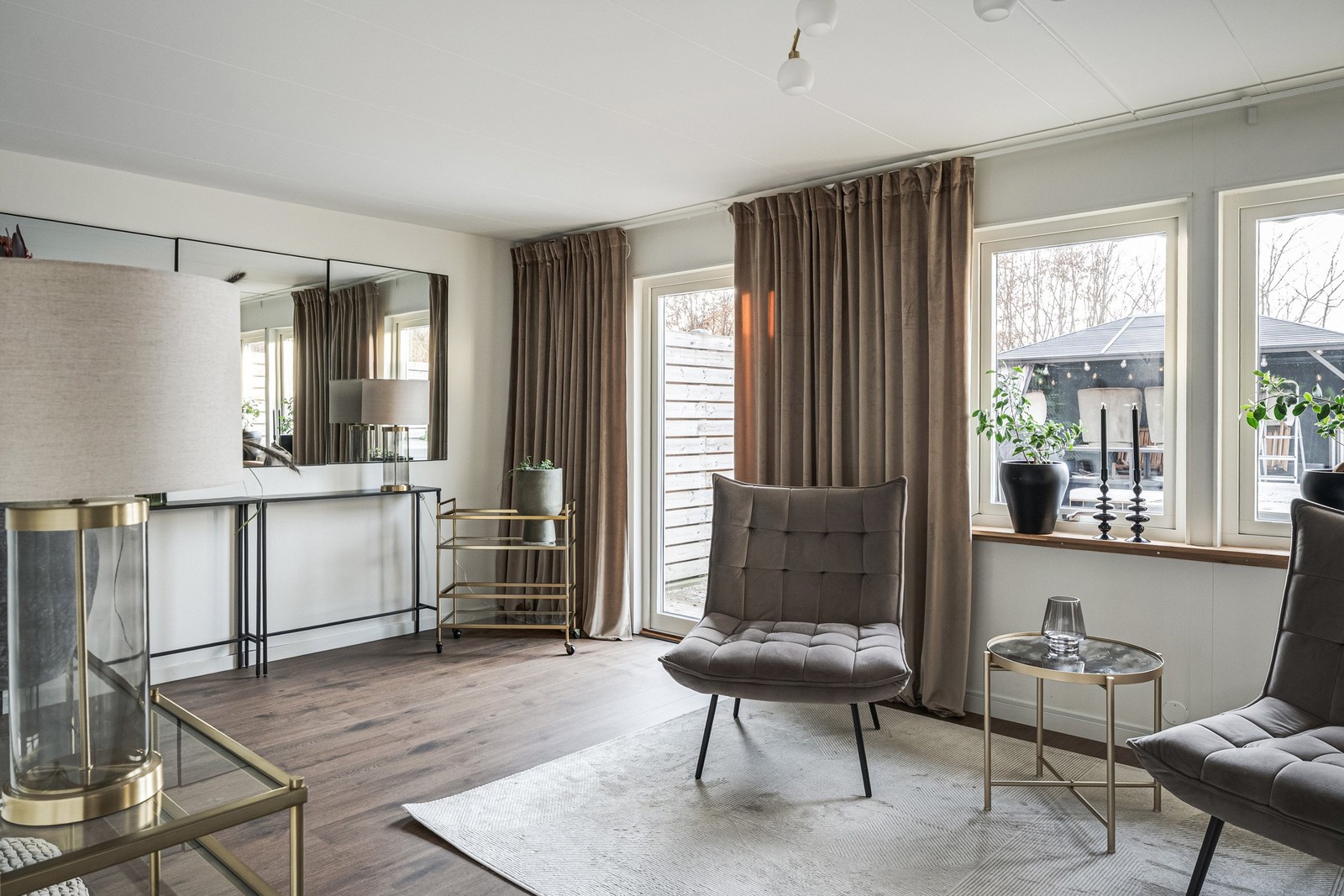 Vardagsrummet nås från både kök och hall. Tack vare stora fönsterpartier flödar ljuset in och rummet känns luftigt och socialt. Här finns gott om plats för soffgrupp och även matbord om du vill ha en större middagsdel. Från vardagsrummet når du altandörren ut till baksidan – bostadens egen lilla oas.