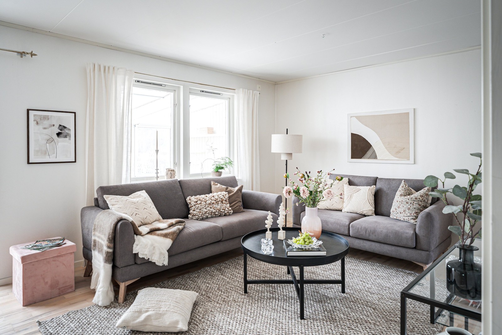 Bostaden erbjuder generösa ytor och en flexibel planlösning som enkelt kan anpassas efter familjens behov. På entréplanet möts du av en välkomnande hall som leder vidare till kök, tvättstuga och gästtoalett. Vardagsrummet är rymligt och socialt med rikligt ljusinsläpp och härifrån når du det inglasade uterummet – en perfekt plats att förlänga utesäsongen och njuta av den rofyllda utsikten mot grönskan.