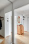När du kliver in i hallen möts du av god rymd och smart förvaring – direkt till höger finns plats för avhängning och rakt in en platsbyggd garderob med spegelskjutdörrar som både ger ordning och en reflekterande yta som öppnar upp rummet. Hallen binder smidigt samman lägenhetens olika rum.