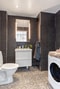 Badrum: Påkostat badrum i mörka toner med tvättdel.