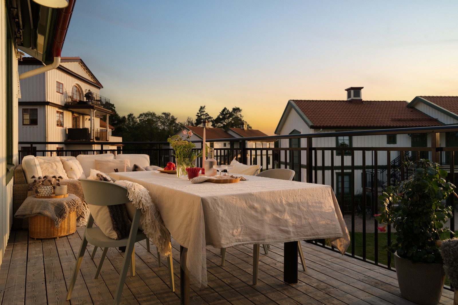 Stor härlig balkong med sjöutsikt som rymmer både soffgrupp och matbord