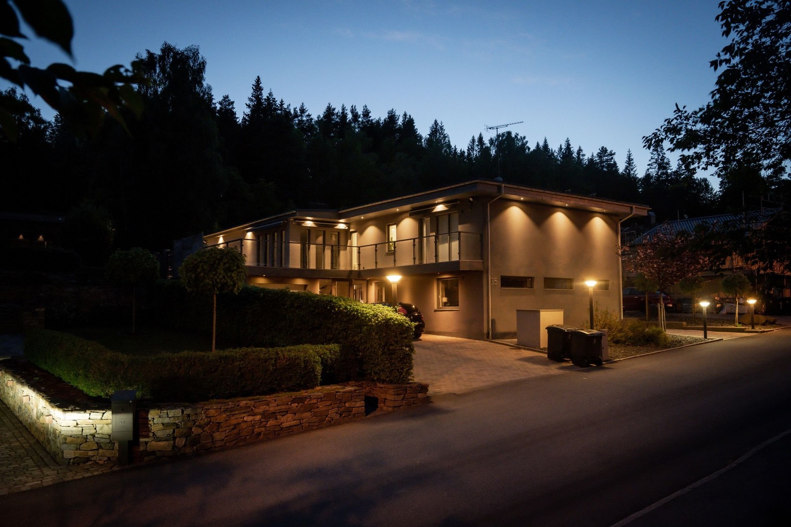 Villan är uppförd i suterräng och bjuder på en generös planlösning där ljuset får flöda genom stora fönsterpartier. Insidan präglas av rena linjer, öppen rymd och ett noggrant kuraterat inredningsspråk. Övre plan rymmer tre sovrum, ett exklusivt kök från Gaggenau med köksö i ek, samt ett luftigt vardagsrum med murad öppen spis och generös takhöjd. Intill finns ett badrum med både bastu och mosaikinklädd badkar, med direkt access till både poolområde och altan.
