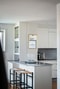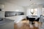 finns i anslutning till vardagsrummet. Här ligger samma fina ekparkettgolv som i övriga bostaden. Vita, släta moderna luckor och vita väggar gör att även det här rummet känns ljust och trivsamt. Stänkskydd i form klinker i grått. Köket är utrustat med induktionshäll, ugn, diskmaskin, mikrovågsugn, fläkt, kyl/frys. Bra belysning i form av infälld LED spotlights i tak.