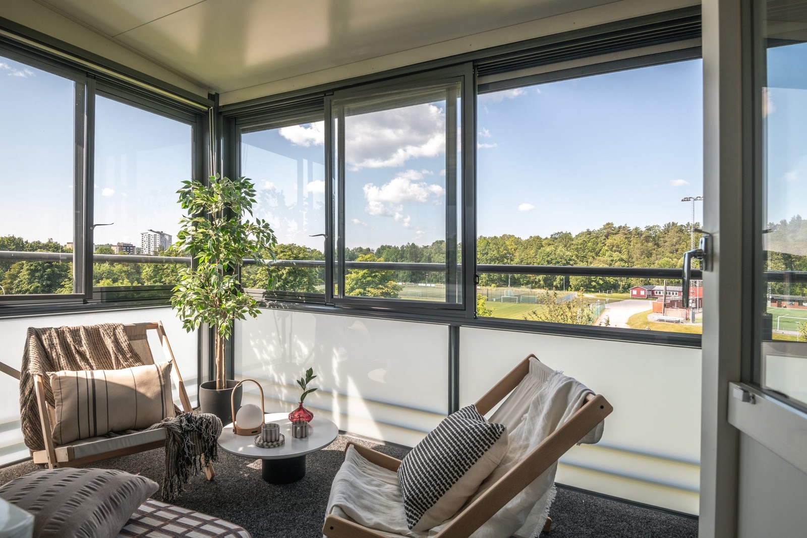 Stor inglasad balkong i uppskattat väderstreck.