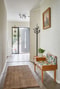 Bostadens andra badrum är inrett med klinkergolv i beige-grå ton och klassiskt vita kaklade väggar. Här finns en dusch, kommod i varm träton, toalett och handdukstork.