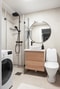 Det nyrenoverade badrummet från 2023 med golvvärme är stilrent inrett med stora beigea klinkerplattor både på golv och väggar. Den övriga utrustningen består av: infällbar duschhörna, wc, tvättställ med ovansittande spegelskåp, handduksvärme samt en kombinerad tvätt/torkmaskin.
