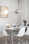 Parkettgolv, vita väggar och gott om ljus från två väderstreck. Här ryms både matbord och soffa utan att det känns trångt. Öppen planlösning mot köket, men med en naturlig avskärmning som ger tydlig rumsindelning.
