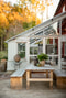 En sommarkväll står sällskapsytornas glasdörr öppen ut till det mycket stora och ljusa orangeriet med plats för både lounge och långbord. Även orangeriet är stiltroget inrett med närmast heltäckande fönsterpartier i traditionell still samt gjutet betonggolv. Ljuset faller in från tre håll och raden av spröjsade fönster öppnar vyerna mot den omfamnande grönskan. Dofterna från grillen blandas med nyklippt gräs. Det skyhöga snedtaket vilar på kraftfulla, obehandlade stålbalkar och glaspartierna på sidorna följer med hela vägen upp till nock. Det luftiga rummet är en veritabel festsal för allt från midsommarafton till kräftpremiären. Innerväggen utgörs av fasadens faluröda lockpanel och här finns ett stiltroget utekök med vask och vitrinskåp. Orangeriets planterade fikonträd brukar ge bra med frukt. Härifrån kommer du även ut direkt i trädgården.