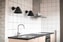 Köket imponerar med sina mörka, eleganta skåpsluckor, ljusa kaklade väggar och generösa arbetsytor. Den öppna och funktionella planlösningen skapar en trivsam miljö för både vardag och sociala tillfällen.