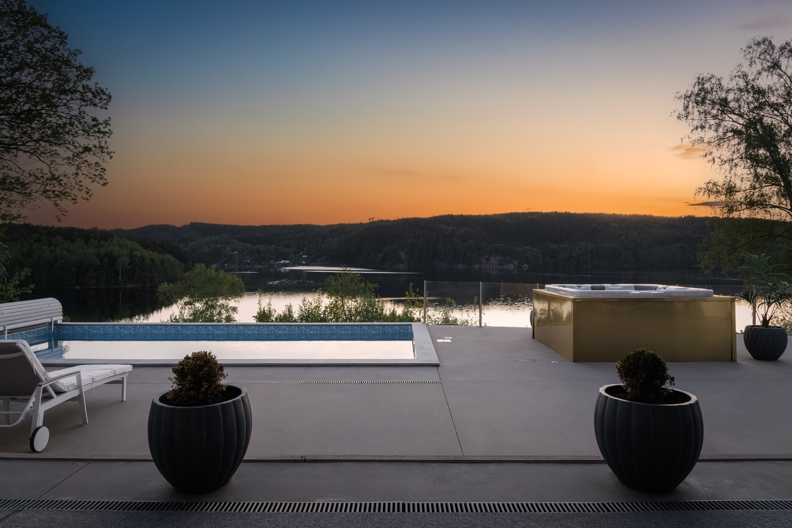 Magnifik sjövilla på högt läge, med fri panoramautsikt och poolområde – knappt 50 meter från vågorna