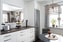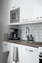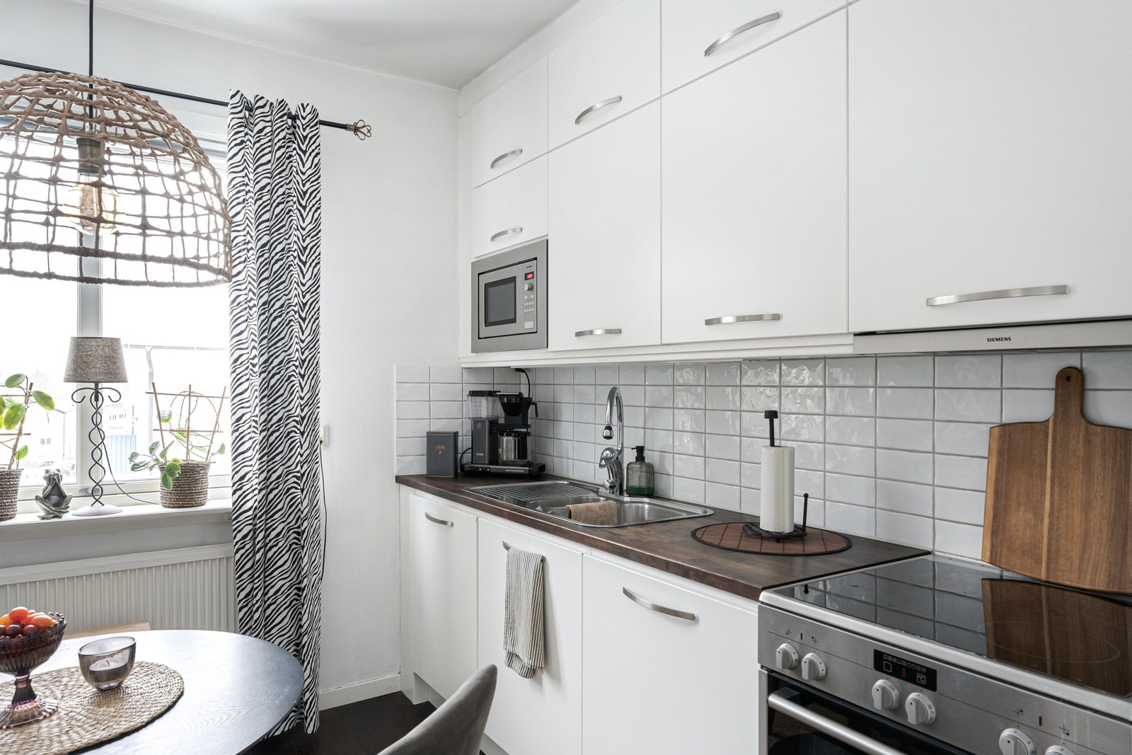 Direkt in till höger från hallen hittar vi det stilrena köket. Massor av plats för förvaring av köksredskap i skåp och luckor. Vita luckor och mörk arbetsbänk ger ett snyggt intryck. Rostfria vitvaror såsom: kyl/frys, spis, micro och köksfläkt. Plats för matbord med 4 stolar framför fönstret.