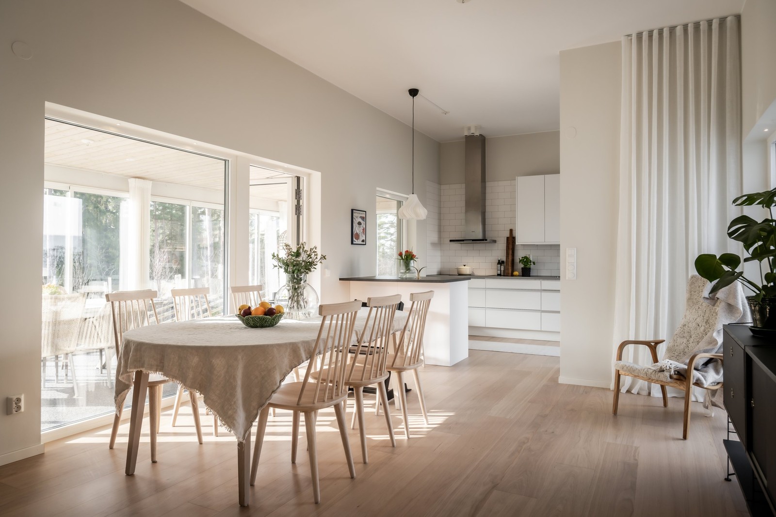 Bostaden präglas av en ljus och öppen planlösning där kök och vardagsrum samspelar på ett naturligt sätt – en perfekt yta för både vardagsliv och sociala tillställningar. De stora fönsterpartierna släpper in rikligt med ljus och tillsammans med det varma, härdade ekgolvet från Bjelin skapas en inbjudande och harmonisk atmosfär. De påkostade tillvalen, såsom spotlights i fönster, stilrena materialval och uppdaterade ytskikt, förstärker känslan av kvalitet och modern komfort.