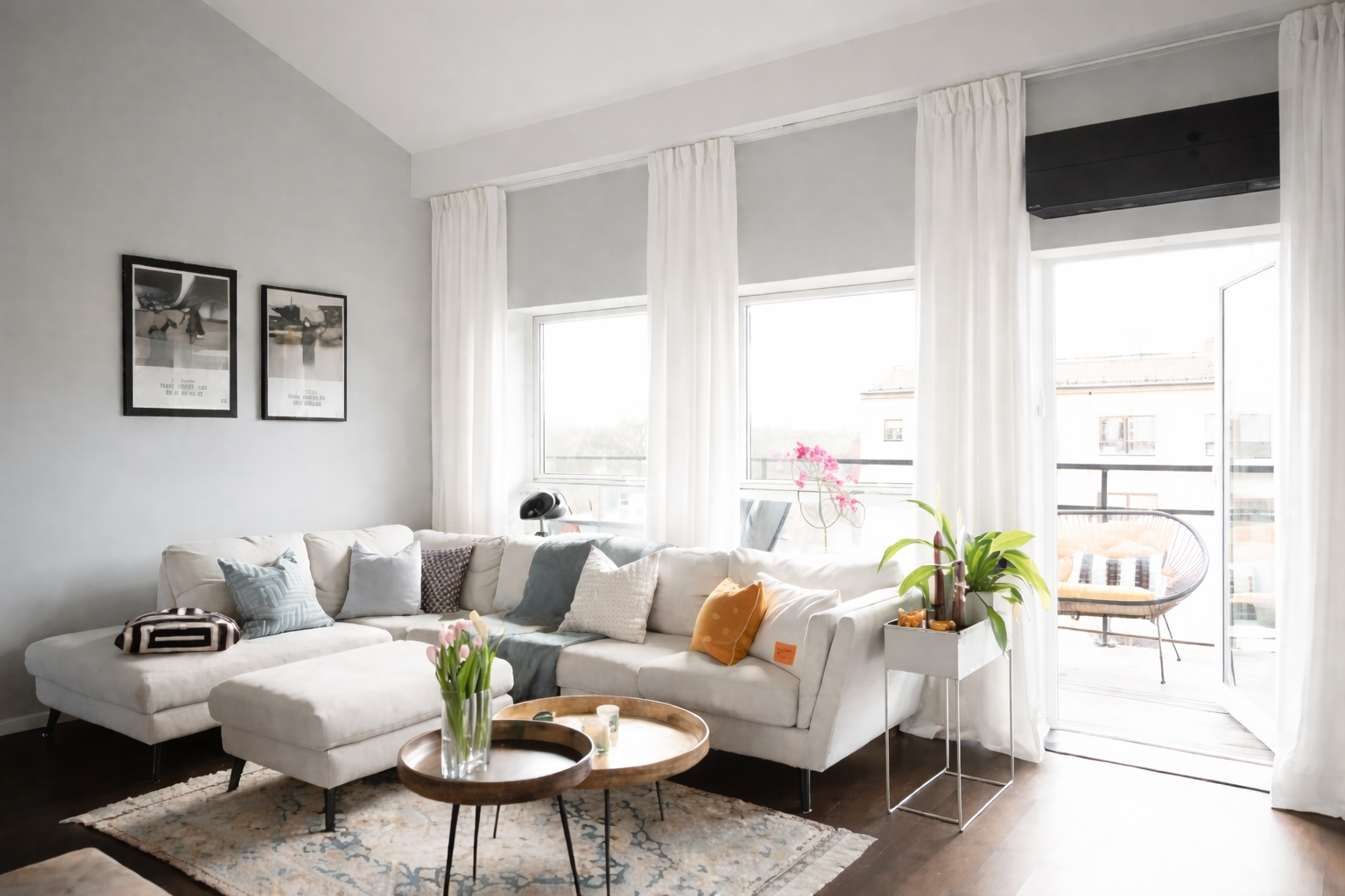 Trea högst upp i huset med öppen planlösning, nockhöjd, AC och stor söderbalkong om 30 kvm – ett ljust hem med härlig rymd och komfort.