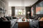 Rymligt vardagsrum med fint ljusinsläpp från de stora fönsterpartierna. Här finns generösa ytor både för soffgrupp och större matplats utan att rummet upplevs trångt. I vardagsrummet är väggarna klädda i mörk träpanel, vilket skapar en stilren kontrast.