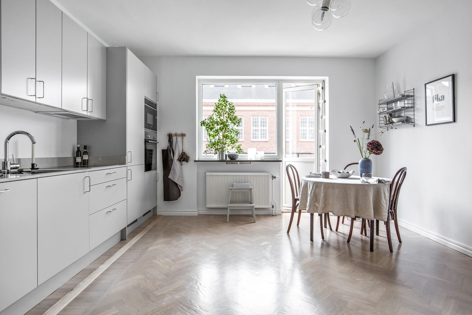 Det nyrenoverade köket har en öppen planlösning med vardagsrummet och är stilrent renoverat och rymmer gott om förvaringsmöjligheter. Här erbjuds goda arbetsytor på den dekorativa och påkostade bänkskivan i vacker sten. Då merparten av kökets vitvaror integrerats - däribland diskmaskin, fläkt och kyl/frys - ges här en mycket harmonisk känsla! Vardagsrummet har en härlig rymd tack vare den öppna planlösningen med köket. Här finns stora fönsterpartier mot Sturegatan samt utgång till balkongen som är belägen i rakt västerläge. Balkongen kan möbleras med loungedel eller mindre sittgrupp. Vardagsrummet och köket rymmer plats för soffgrupp med tillhörande möblemang samt matbord och stolar för fyra till sex sittande gäster.