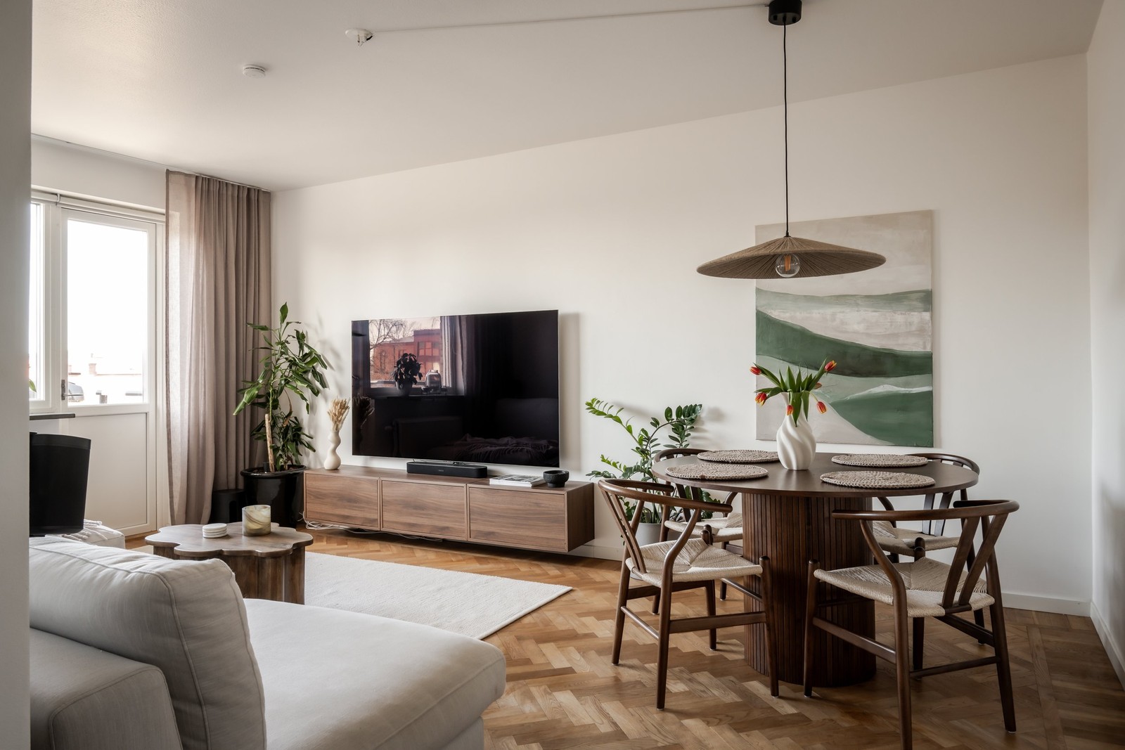 Bostaden erbjuder ett rymligt vardagsrum med gott om plats för både större soffgrupp och middagsbord utan att rummet upplevs trångt. Golvet pryds av vacker parkett i klassiskt fiskbensmönster och väggarna är vitmålade. Från vardagsrummet nås balkongen i soligt sydvästläge, där du kan njuta av solen från lunch till sen kväll samtidigt som du blickar ut över omgivningarna.