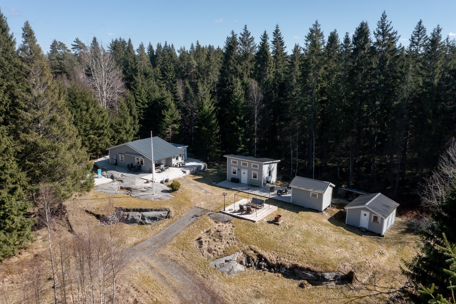 Stor och naturskön tomt i privat läge med minimal insyn. Här samsas gräsytor, skogskänsla och ett vackert berg som bryter fram i trädgården, tillsammans med generösa altandäck som binder samman bostad och gästhus i en trivsam helhet.
