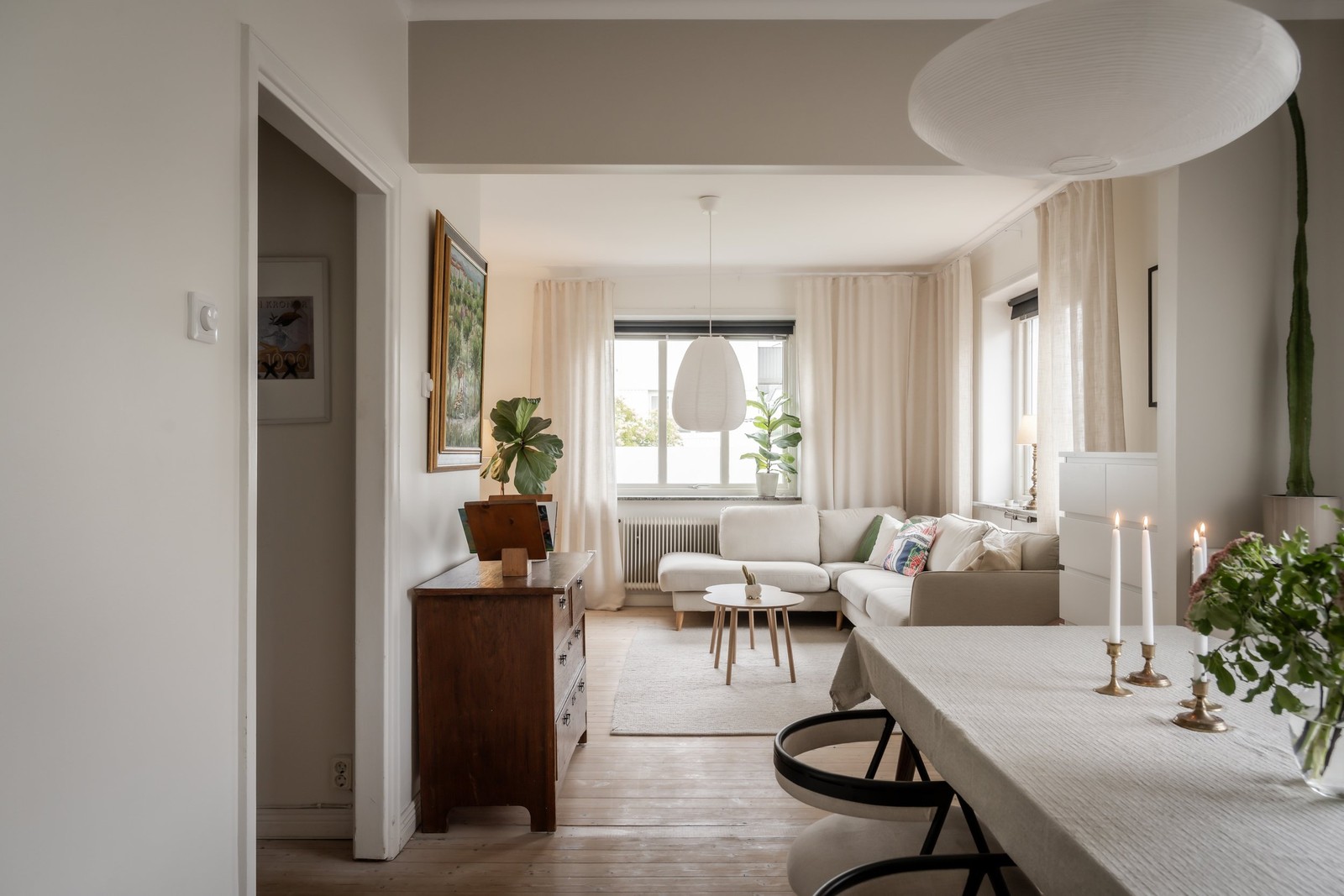 I Brf Stenbocken välkomnas du till en ljus, välplanerad och smakfullt renoverad två-och-en-halva där 30-talets klassiska detaljer möter moderna bekvämligheter. Redan i hallen infinner sig trivseln – generös takhöjd, vackert betsat furugolv som löper enhetligt genom bostaden samt praktisk klädkammare och goda avhängningsmöjligheter.