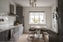Köket är både estetiskt och funktionellt med ljus atmosfär, eleganta gråa luckor och bänkskiva i ljus laminat. Vitt kakel i liggande sättning ger en tidlös karaktär. Här finns full maskinell utrustning i form av spishäll, ugn, mikro, kyl/frys, diskmaskin samt vägghängd fläkt. Den generösa matplatsen rymmer enkelt fyra personer och erbjuder en lummig utsikt över omgivningarna.