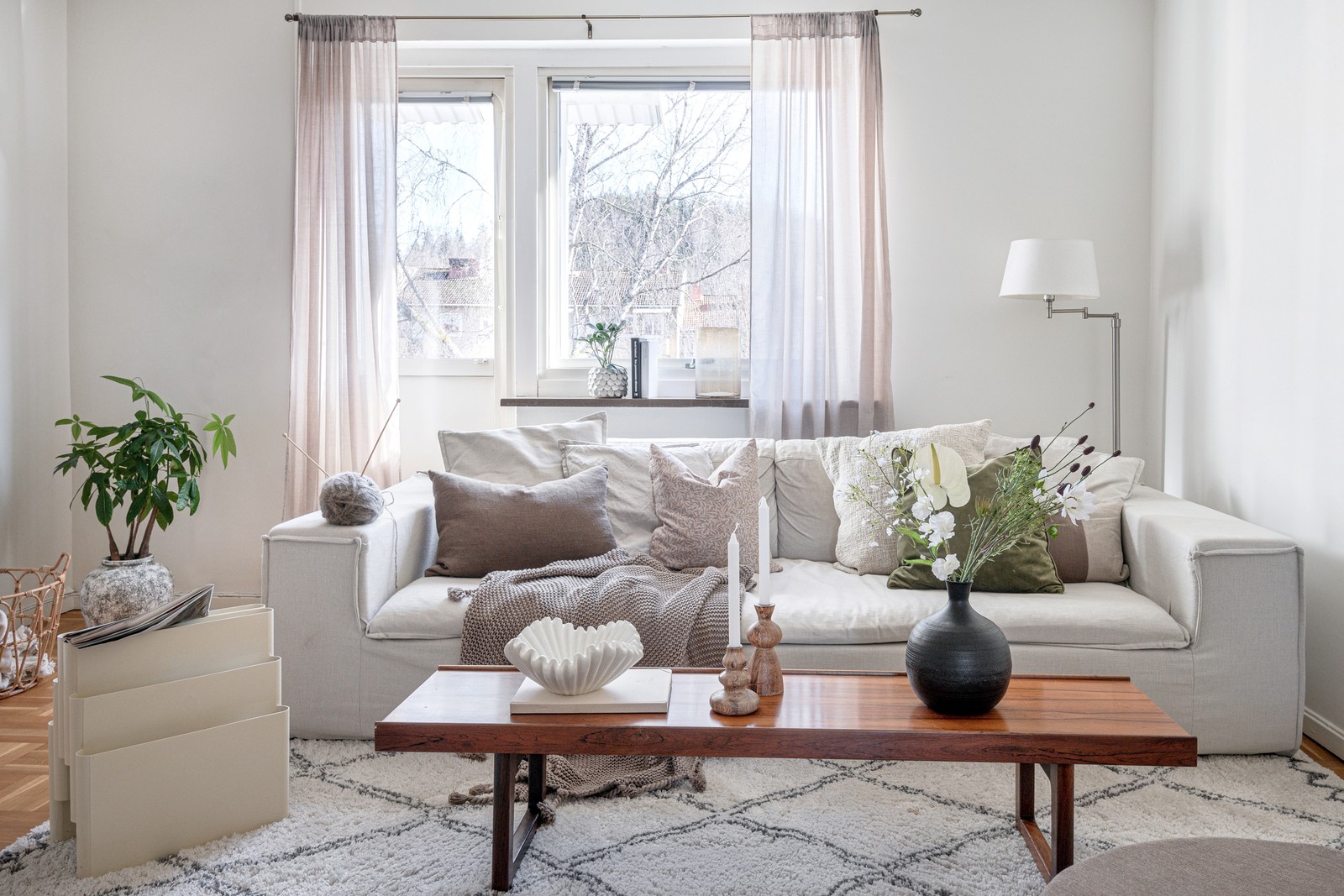 Rakt fram och till höger om entrén finner ni vardagsrummet, bostadens givna sällskapsplats. Soffgruppen samsas med tillhörande tv-möbler och matsalsbord utan att förlora den öppna känslan. Golvet pryds av en fin ekparkett i holländsk läggning och väggarna är vitmålade. Fönstren tillsammans med den glasade balkongdörren bidrar till en härlig rymd. Balkongen är rymlig och har plats för utemöbler och planteringar, här kan man njuta av solen med en vacker utsikt över området.