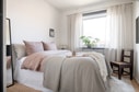 Intill köket ligger sovrummet, ett mysigt och yteffektivt rum. Rummet har vitmålade väggar och även här ligger det vackra originalgolvet i trä. Här finns plats för dubbelsäng, tillhörande sängbord, ytterligare möblering om så önskas samt god förvaring via garderoberna längs ena väggen.