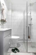 Badrummet är modernt renoverat i klassiska färgval där reklangulärt ljust kakel möter ett smakfullt hexagonmönstrat klinker i en ljusgrå ton. Här återfinns wc, dusch bakom duschvägg i glas samt tvättkommod med ovansittande spegel med vacker belysning.