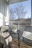 Rakt fram och till höger om entrén finner ni vardagsrummet, bostadens givna sällskapsplats. Soffgruppen samsas med tillhörande tv-möbler och matsalsbord utan att förlora den öppna känslan. Golvet pryds av en fin ekparkett i holländsk läggning och väggarna är vitmålade. Fönstren tillsammans med den glasade balkongdörren bidrar till en härlig rymd. Balkongen är rymlig och har plats för utemöbler och planteringar, här kan man njuta av solen med en vacker utsikt över området.