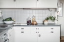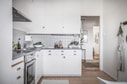 Till vänster nås hemmets charmiga kök. Vita köksluckor möter en modern bänkskiva och ovan sitter ljust kvadratiskt kakel som förstärker den ljusa atmosfären. Köket är utrustat med spis, fläkt, ugn och kyl/frys. Matbord för fyra personer ryms enkelt intill fönsterpartiet.