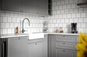 Köket upplevs fräscht och är ett resultat av moderna och smakfulla val. Ljus gråa skåpsluckor rymmer gott om förvaring och på bänkskivan i sten blir matlagningen ett nöje. Vitt liggande kakel ovanför förstärker den ljusa atmosfären. Här finns induktionshäll, ugn, vägghängande fläkt och diskmaskin, tvättmaskin och kyl/frys. Köket ger utrymme till ett matrumsbord för fyra sittande gäster, härligt ljusinsläpp från ett centralt fönster med lummig utsikt över området.