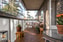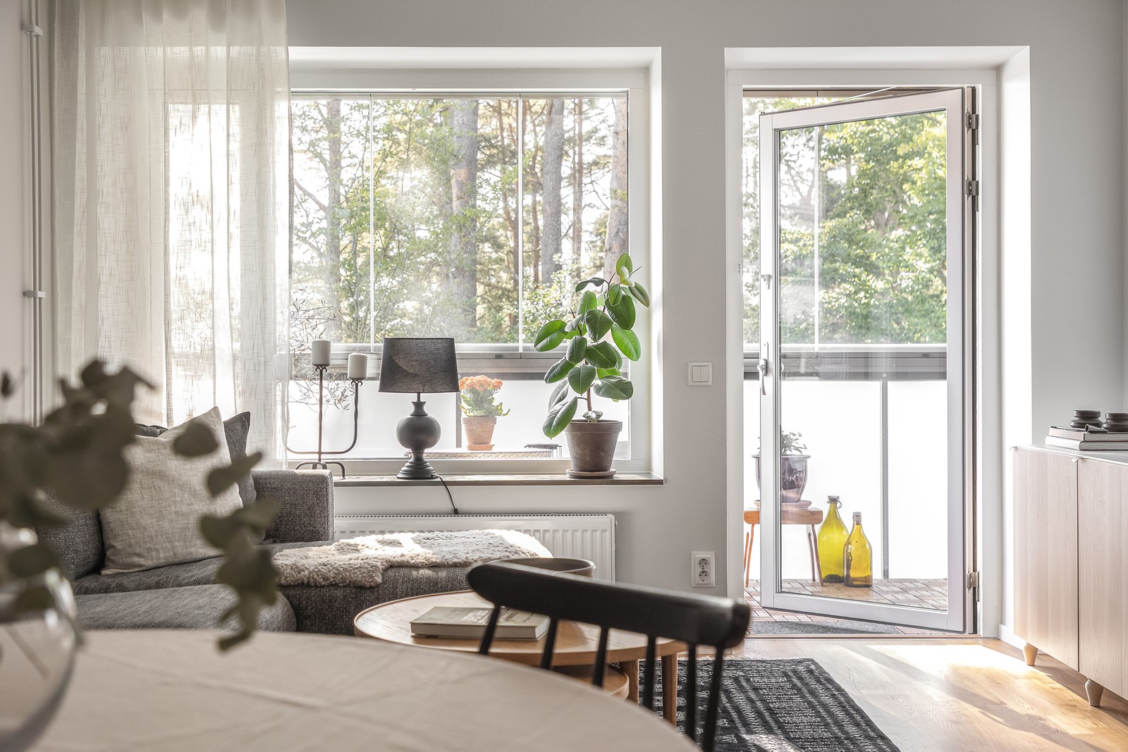 Ljust vardagsrum med plats för större soffa och tillhörande möblemang. Breda fönsterbrädor i sten ger en stilfull känsla och härifrån nås bostadens soliga balkong. Generös och trivsam balkong med härlig utsikt över staden. Läget mot sydväst bjuder på många soltimmar, samtidigt som skogspartiet utanför ger en rogivande och skyddad känsla. Tack vare inglasningen och de stilfulla trallplattorna kan balkongen nyttjas som ett extra rum från tidig vår till sen höst.