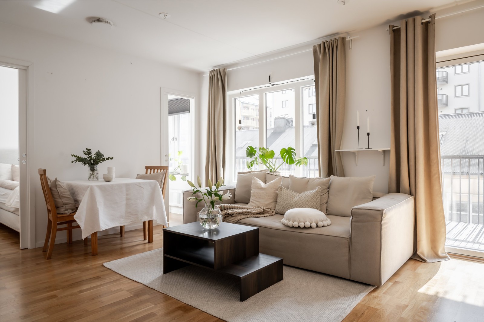 Kök och vardagsrum samspelar i en öppen och social planlösning med plats för både matbord, soffgrupp och tv-möbel – en perfekt yta för såväl vardagsliv som umgänge. Från vardagsrummet når du den generösa balkongen om ca 10 kvm, som blir en naturlig förlängning av bostaden.