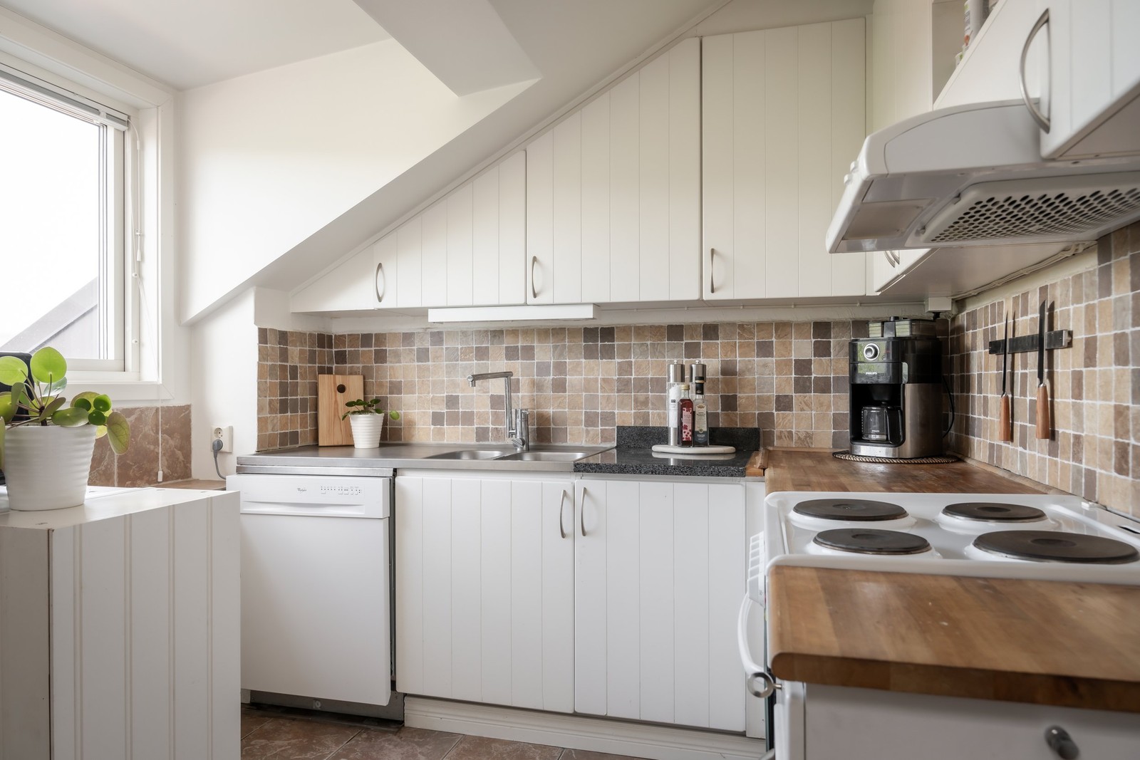 Ljust kök i vinkel med vita luckor och bänkskiva i ek. Mellan överskåp och bänkskiva sitter kakelplattor som stänkskydd. Den maskinella utrustningen består av spis, ugn, fläkt, diskmaskin, kyl och frys. Från köksfönstret från man både fint ljusinsläpp och