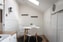 Fräscht badrum med vita kaklade väggar och våtrumsmatta på golvet i orientalisk stil. Inredningen består utav wc, dusch, tvättställ med kommod, samt en kombinerad tvättmaskin/torktumlare. Takfönstret bidrar med fint ljusinsläpp.