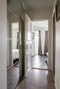 Master bedroom erbjuder plats för en dubbelsäng. Golvet är belagt med mörkt laminat och väggarna är vitmålade. I hallen utanför sovrummet finns praktiska, inbyggda garderober med spegelskjutdörrar. Härifrån nås även bostadens balkong, vilket ger en fin förlängning av rummet.