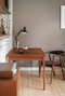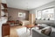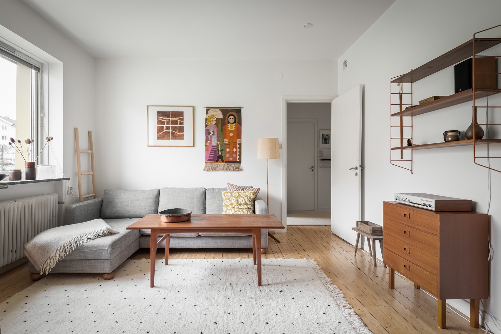 Vidare in till vänster når ni vardagsrummet där man direkt slås av det ljus och den rymd som finns i detta rum. Här finns plats för soffgrupp, en större säng och övrigt möblemang utan att det känns trångt. De vitmålade väggarna tillsammans med den gråbruna fondväggen och furugolvet ger en diskret bas att inreda efter.