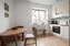 Bostadens charmiga kök har vita skåpsluckor och vitt kakel. Här finns kyl/frys, spis och ugn. Här ges plats för ett matbord med plats för flera sittande gäster invid fönsterpartiet.