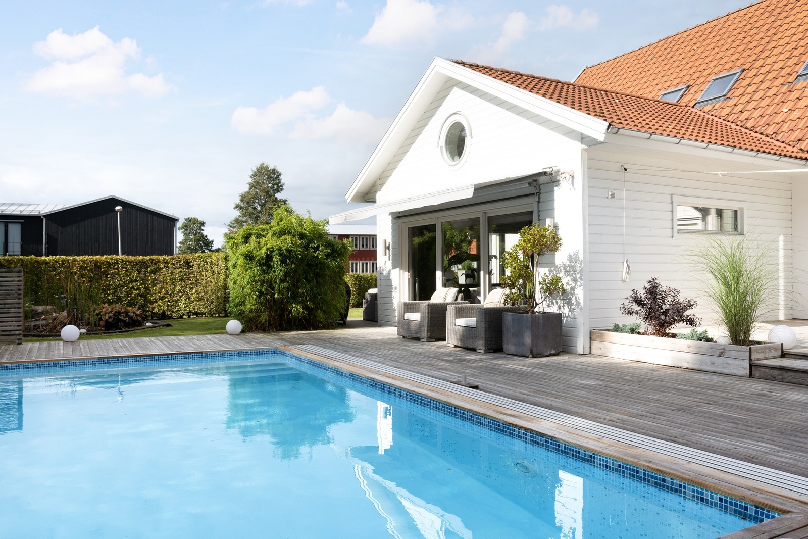Sjöutsikt, poolområde, och strålande ljusa rumsvolymer - knappt 50 meter från sjön