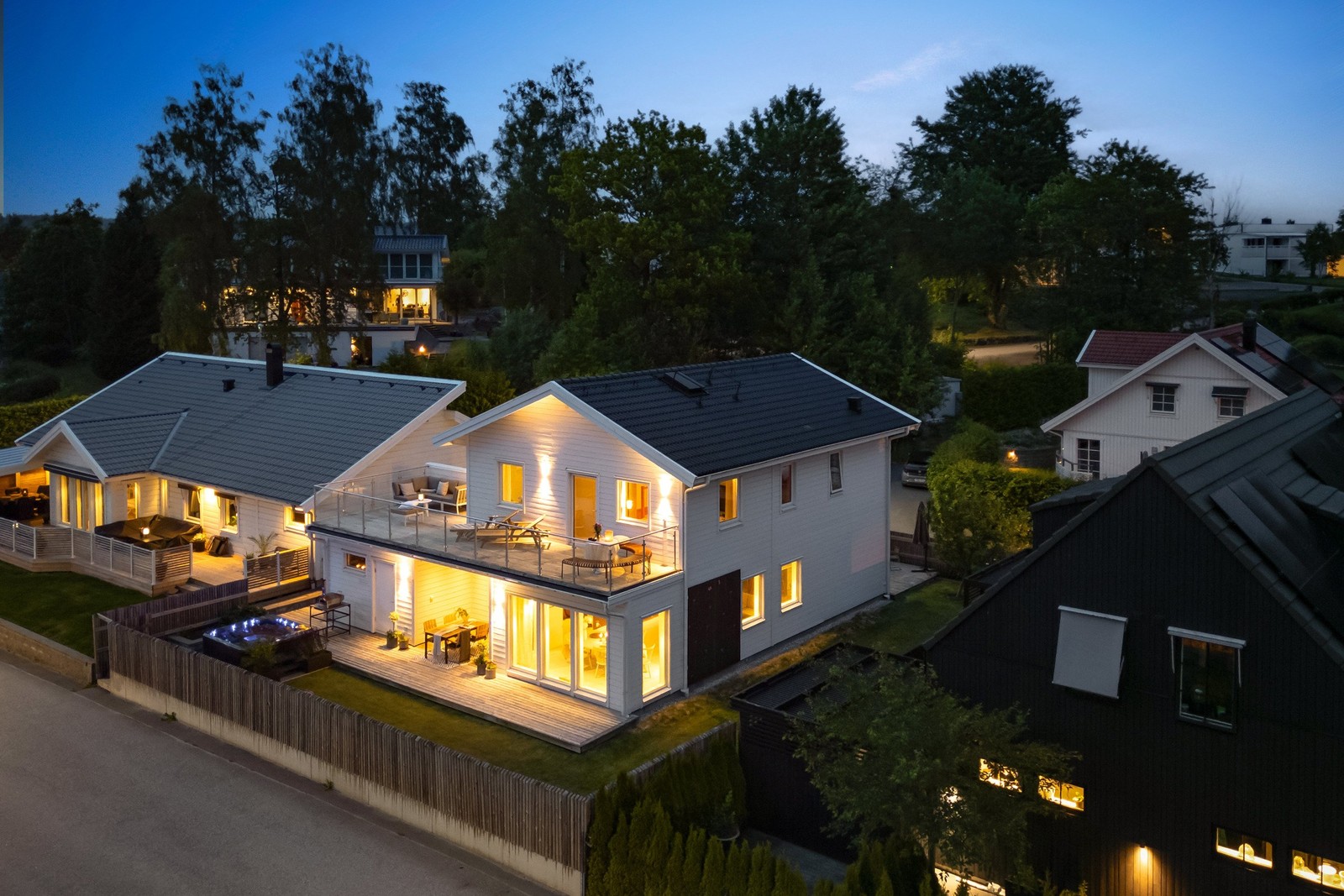 Vardagsrummet bjuder in till umgänge och avkoppling, och den öppna planlösningen gör det enkelt att umgås över ytorna – perfekt för både familjeliv och middagar med vänner. Från sällskapsytorna finns direkt access till de stora terrasserna i underbart västerläge, där solen vilar över huset från eftermiddag till sen kväll. Här kan du njuta av sköna grillkvällar, vila i loungemöblerna – eller ta ett kvällsdopp i det inbjudande spabadet medan solen går ner över trädtopparna.