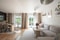 Vardagsrummet är rymligt och lättmöblerat med plats för både matsalsmöbel och soffgrupp. En vägg klädd i trästavar ger en distinkt fond, medan det stora fönstret och glasdörren mot baksidans altan ger ett generöst ljusinsläpp. Härifrån når du den skyddade uteplatsen med pergola och nedgång till gräsmattan – perfekt för sommarens middagar och avkoppling.