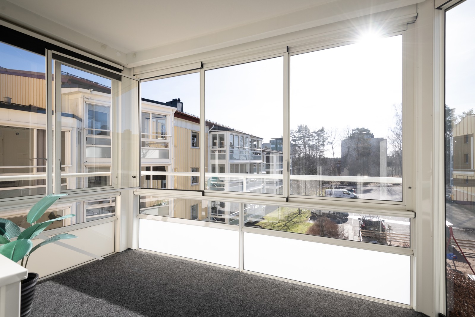 Inglasad balkong i anslutning till vardagsrummet